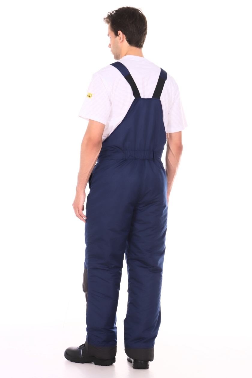 ➠ Полукомбинезон с центральной застежкой на двухзамковую тесьму «молния», с внутренней ветрозащитной планкой, с притачными по линии талии полочками и спинкой. На левой полочке накладной карман с клапаном.. Спинка стянута по линии талии эластичной тесьмой.. Передние половинки с карманами с отрезным бочком, с наколенниками. Внизу боковых швов обработаны разрезы, застегивающиеся на тесьму «молния». По низу полукомбинезона пуфты.