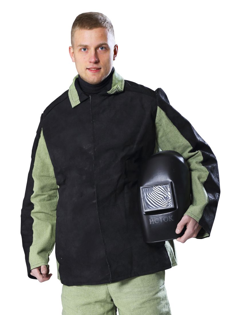 Рукава с усилительной накладкой в верхней части по всей длине рукава из спилка, с патами по низу. Воротник отложной. В верхней части боковых швов, под проймами обработаны вентиляционные отверстия.
